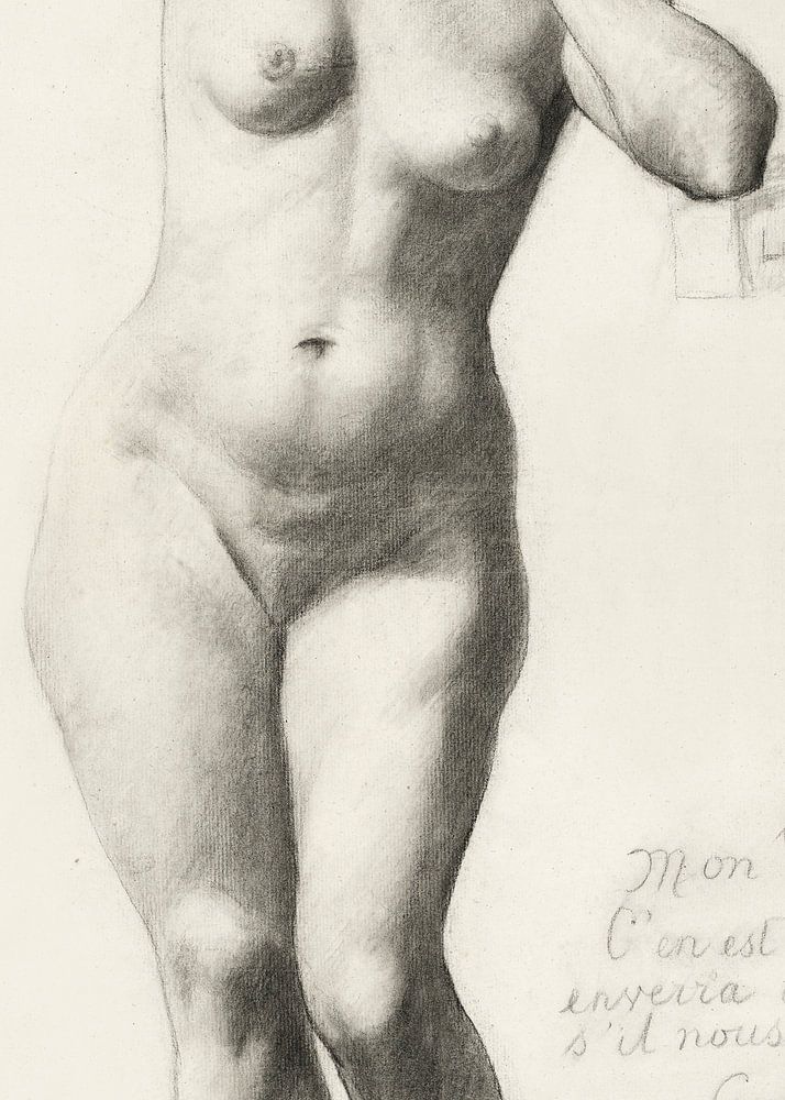 Woman stands as a nude model in this drawing or illustration making of the girl's legs, hips, stomach, torso and breasts exposed on this nude portrait.