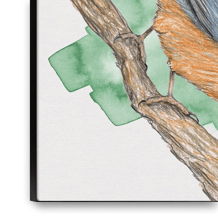 A drawing in coloured pencil of a tree stickler. The background is a green watercolour wipe on warm coloured paper. The little bird sits on a sloping tree branch with its tail up.