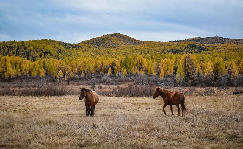 Two horses on the steppe in central Mongolia, with the contrasting autumn colours of the Khangai Mountains as a backdrop.