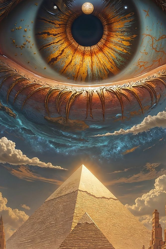 Above the blazing expanse of the desert rises a colossal eye, hovering like a cosmic omen over the ancient pyramids of the Pharaoh. Its gaze of burning gold and unfathomable depth seems to pierce through both time and space.
