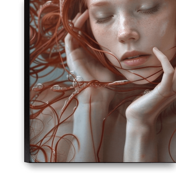 A young woman, surrounded by wavy red hair, lies relaxed with her eyes closed. The details and textures of her hair, reminiscent of coral and seaweed, create a dreamlike underwater world. This artful portrait captures the essence of calm and serenity and is ideal for lovers of surreal and nature-inspired art.