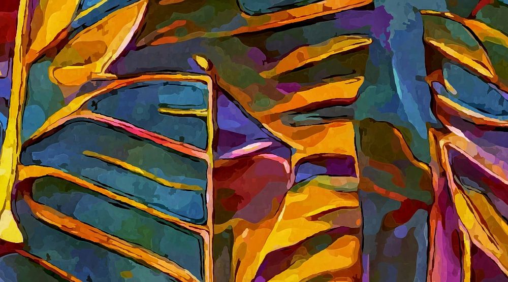 Abstract impression of autumn leaves that are partly or completely weathered. Some leaves still show some leaves, while others show only a few veins. In ochre, yellow, green, reddish and brownish and faint violet and bluish colours.