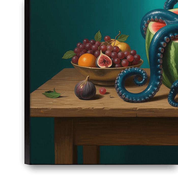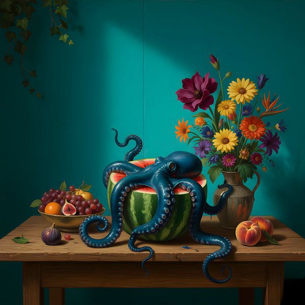 This fascinating work of art transports you to a world full of surprises and vivid contrasts. At the centre of the scene, a majestic, deep blue octopus sits enthroned on a halved watermelon, whose bright red flesh provides a spectacular splash of colour. Its elegantly curved tentacles extend across the table, lending the scene a…