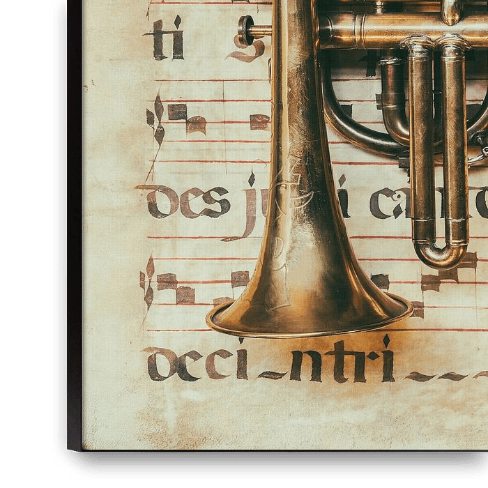 Authentic medieval music sheet on parchment with an antique trumpet