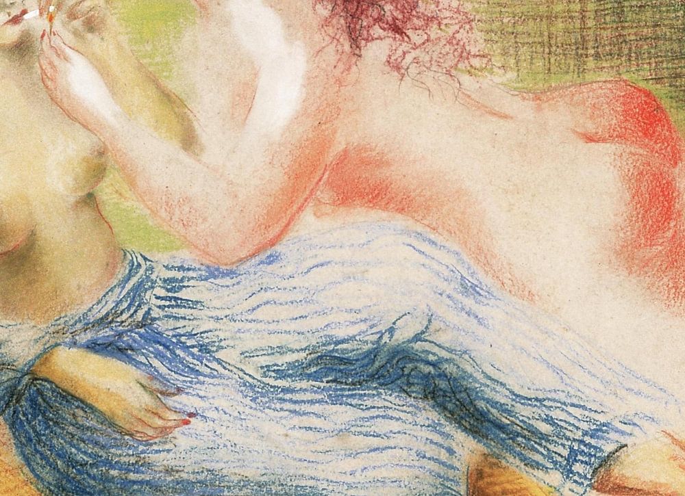 A lesbian couple consisting of two women lie together romantically smoking and sharing a cigarette. One woman wears her clothes open leaving her torso and breasts exposed in the portrait. The other girl lies naked next to the first young lady making her buttocks prominent in the painting.