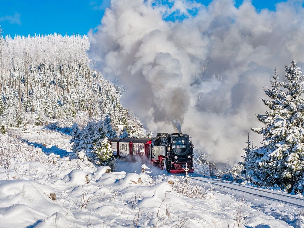 Wonderful winter weather: blue sky, fresh snow - ideal for a trip to the Harz mountains! Here the Brocken railway is travelling at full steam above Schierke (near the Alte Bobbahn ascent) towards the Brocken railway station.