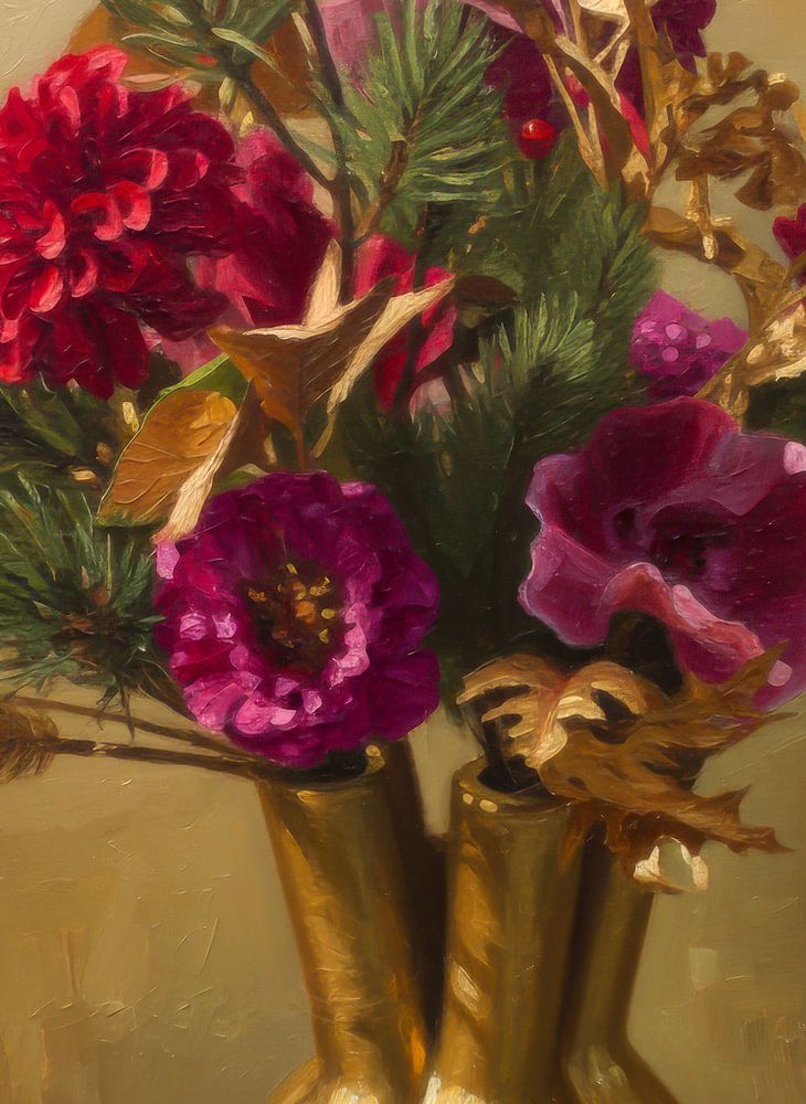 About "Oil Painting Still Life - Winter Flowers in Golden Vase"