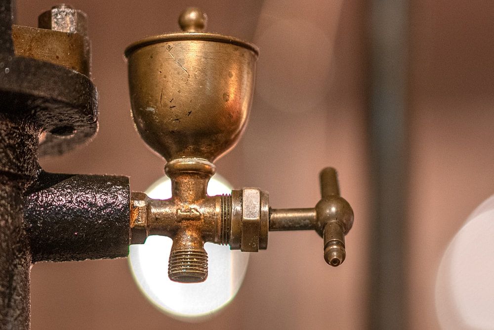 A historic copper oil spigot on an old ship with a blurred background that makes t look like it is free standing.