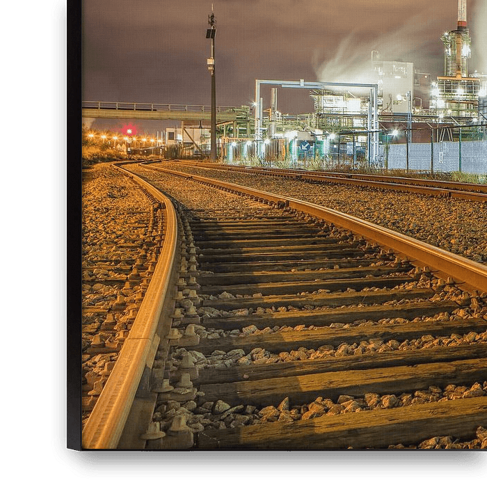 Buy the photo Oil refinery at night with rails and silos against a cloudy sky by Tony Vingerhoets on canvas, ArtFrame, poster and wallpaper, printed on demand in high quality.