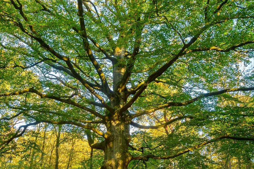 Massive old Beech tree in a beeh tree forest with green and golden brown leafs in the Rijsterbos nature reserve in the Gaasterland region in Frisia, Netherlands.
