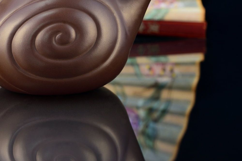 On a black table, a clay teapot is reflected in front of a colourful fan from China