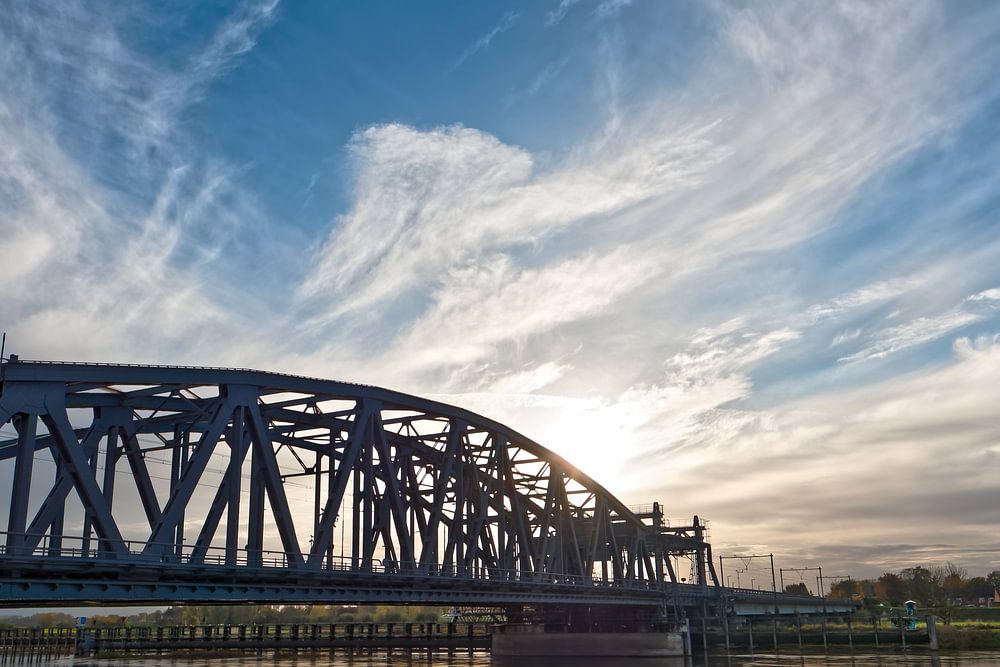 Landscape photo with impressive skies over the Old Steel IJssel Bridge connecting Zutphen with Hoven.