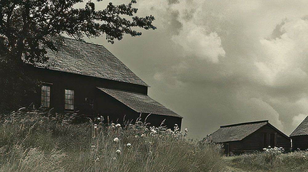 This artwork has an elegant and mysterious look with a strong contrast between light and dark. The style is reminiscent of a mix of illustration and fine-art photography, giving the landscape an ethereal, graphic quality. The black and white and subtly tinted composition gives the work a timeless and sophisticated look.