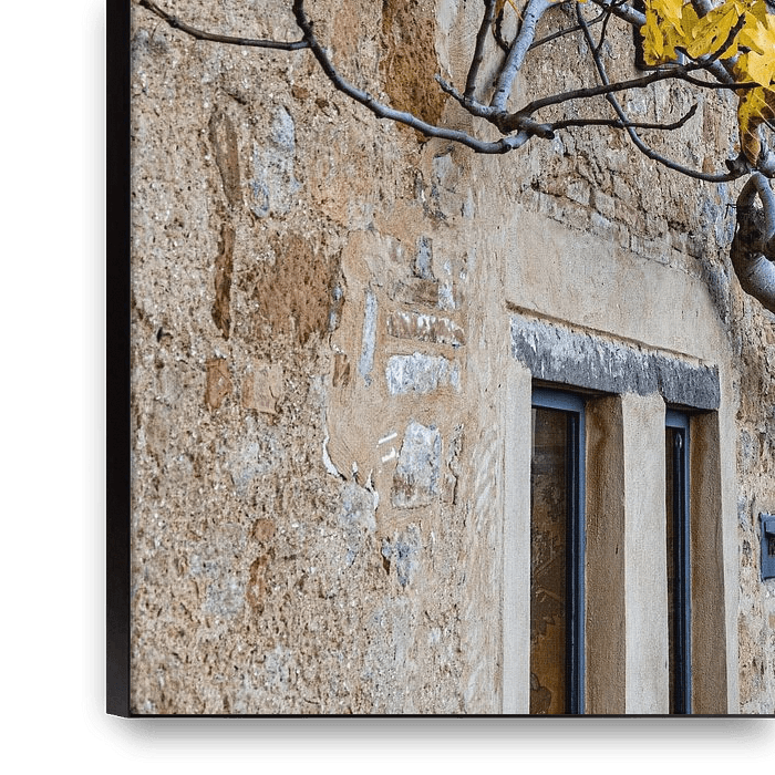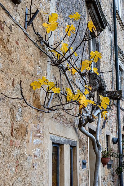 Tree growing along facade.