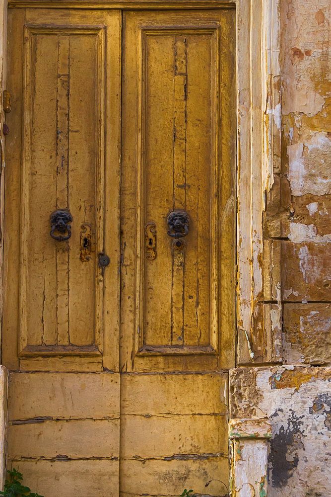 Old battered ochre door with doorknockers and 3 steps in front of it in a dilapidated building. Some green broken plaster on the pavement.