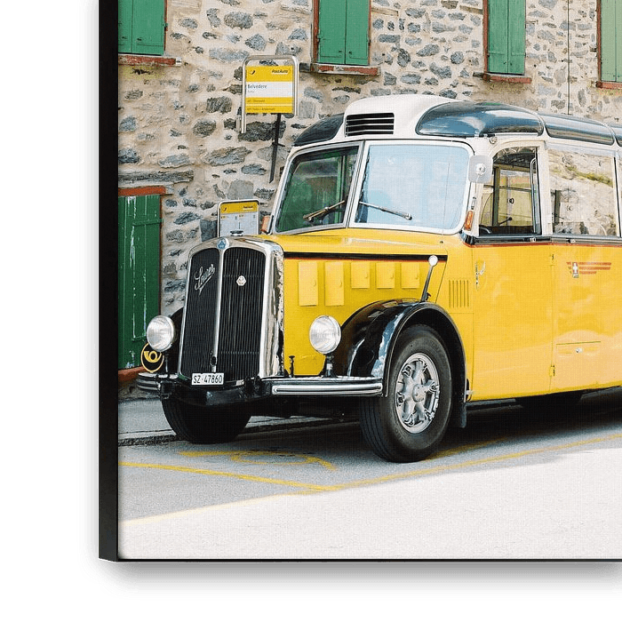 You can find this old yellow bus on the Furka Pass in Switzerland, near Andermatt. This bus is in front of Hotel Belvedere, an old brick building with green wooden shutters. A lovely vintage style!
