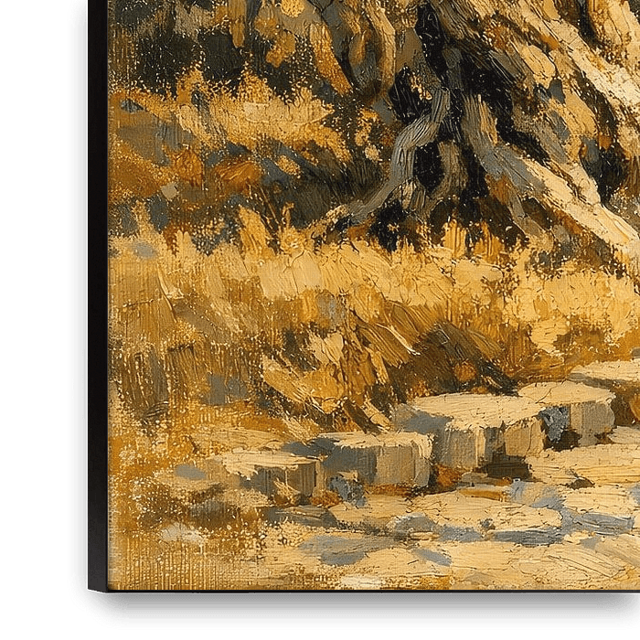 A serene oil painting of an ancient olive grove bathed in warm Mediterranean morning light. Gnarled silver-green olive trees with twisted trunks cast filtered shadows onto golden-yellow grass. A weathered stone path winds through the grove whilst gentle mountains fade into the distance. The dry brushwork on the tree bark and the impasto…