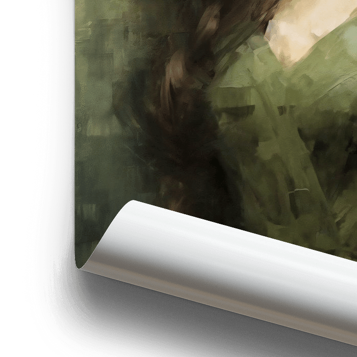Impressionist portrait of a young woman with long brown hair wearing an olive green dress with a large hat.