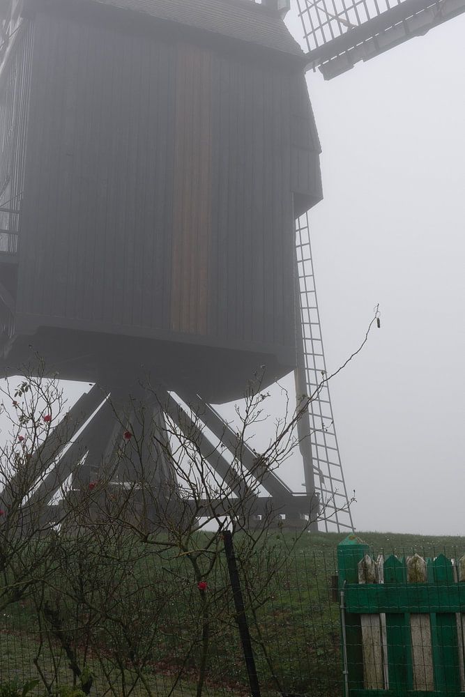 This beautiful windmill is located in a small town (Roosdaal) in Belgium during a misty morning.