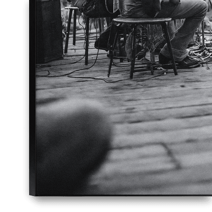we watch the band from behind the stage on a festival ground. it looks like Woodstock. It's the atmosphere of the 60s. in this picture, you can feel the atmosphere of relaxed music