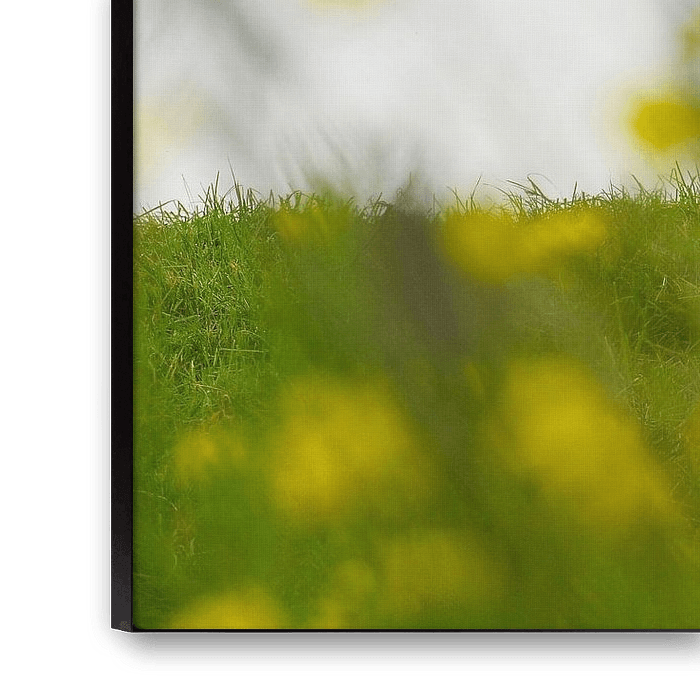 Buy this flower art On the dike with yellow flowers and white cow by Blond Beeld on canvas, ArtFrame, poster and wallpaper, printed on demand in high quality.