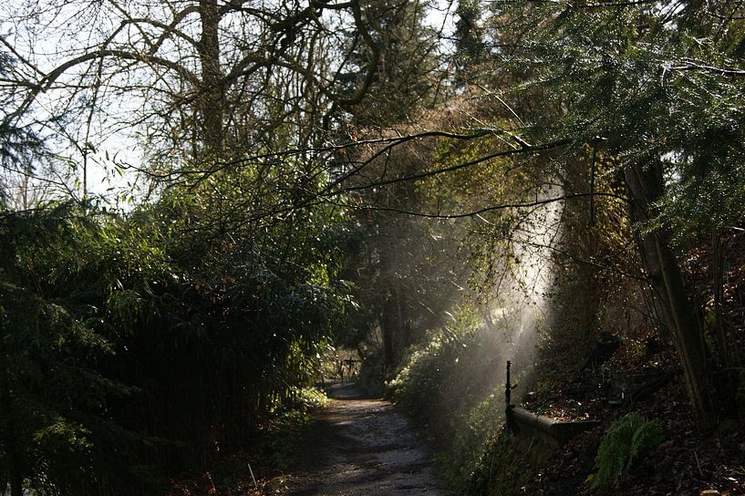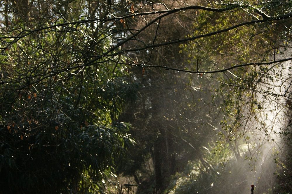 One of those moments that disappears after it passes by. A second earlier or later, I could not have taken this picture, something that really appeals to me. There are thousands of footpaths through greenery, there are thousands of water sprinklers, and yet this moment will not happen again.