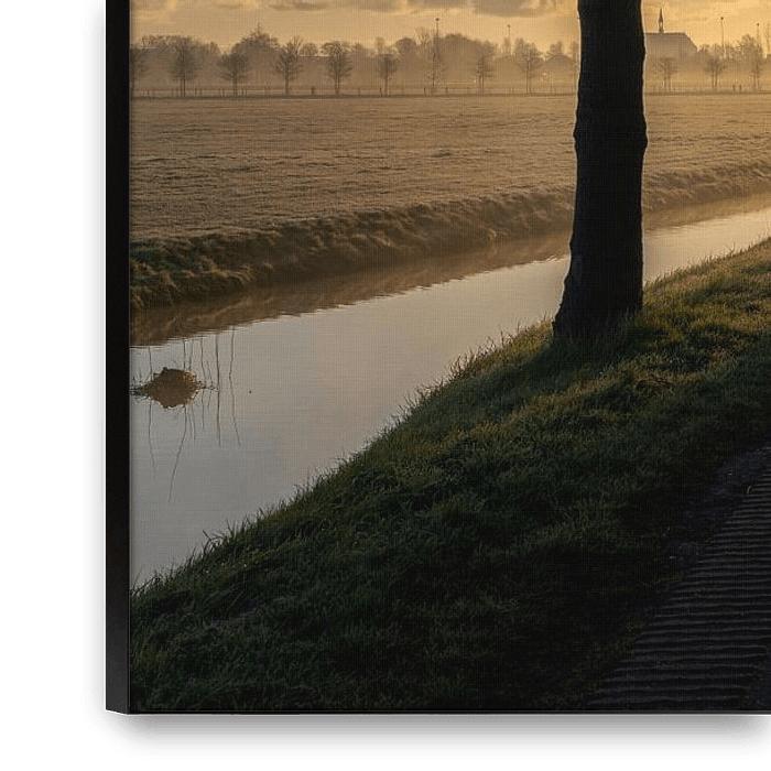 A deserted country road in the north of the Netherlands. The sun peeps through the trees and the rays of sunlight warm the road. It doesn't get more Dutch than this.