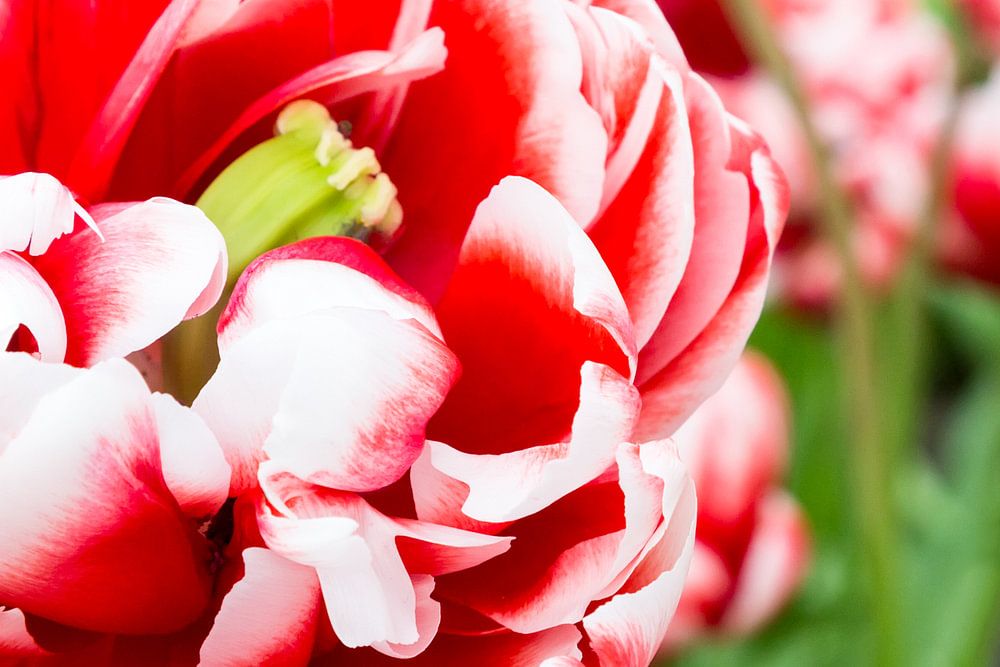 One bicolor red-white tulip in front of many similar flowers. Flowerfield as blurry background. Tulip with red, pink, and white colors and green steels and leaves in spring season.