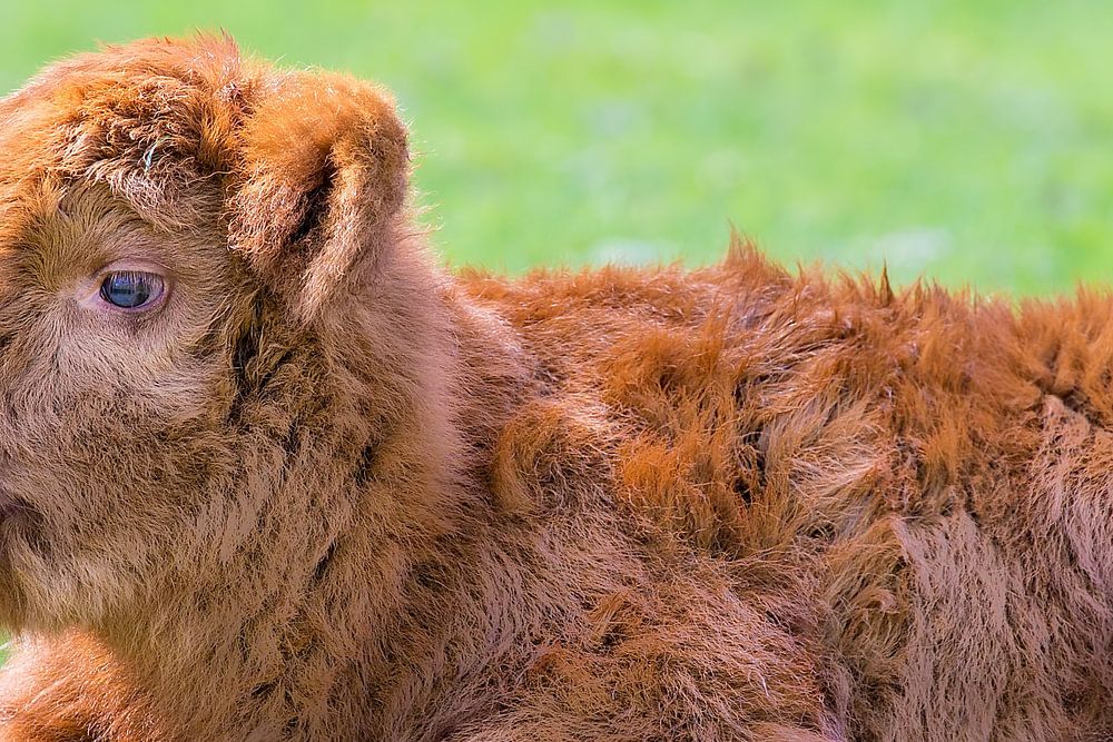One newborn brown scottish highlander calf lying in green meadow. This young calf is only one week old and already enjoying the sunny weather in spring season. I took this photo in a dutch landscape.
