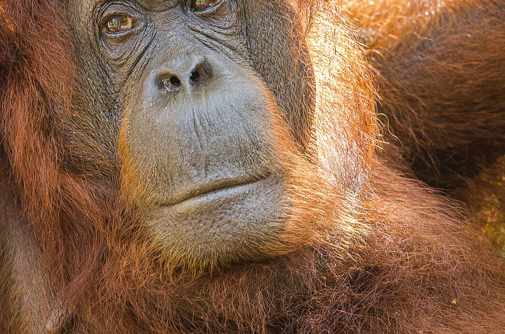 Portrait of a female orang-utan hanging in a tree looking at camera