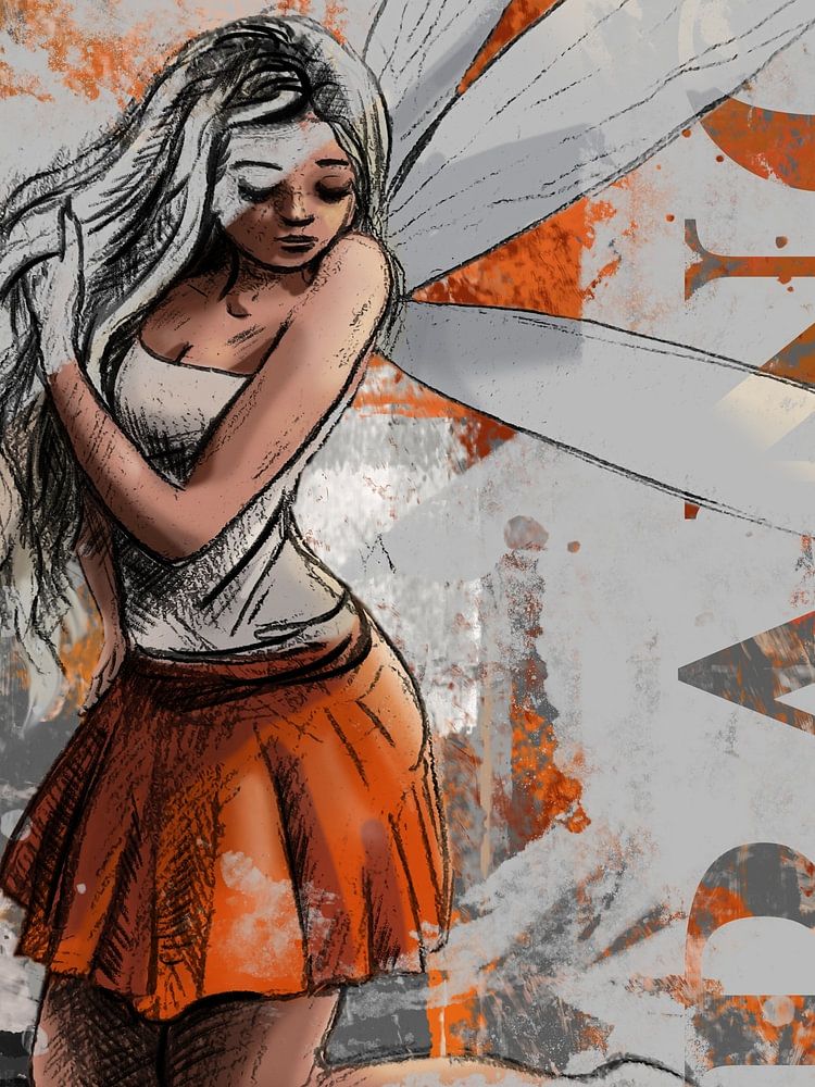 Combination of drawing in grey tone and coloured drawing. Mixed media artwork. Original with pencil and fineliner on paper. Digitally coloured in with digital drawing techniques. Artwork in orange and grey.
