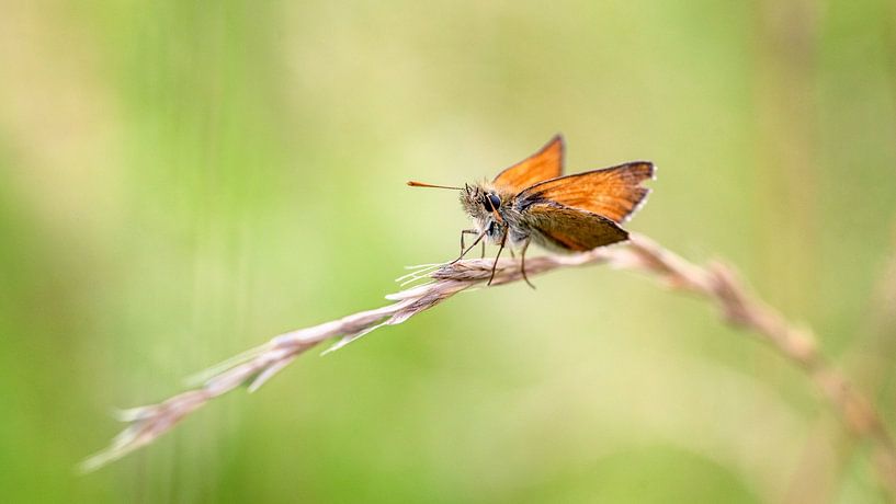 A close-up portrait of a Small Skipper butterfly (Ochlodes sylvanus) delicately perched on a swaying grass stem. Captured in soft natural light, the image highlights the rusty orange tones and the fuzzy detail of this little summer wanderer. Shot with a Nikon D750 and Tamron 90mm, handheld in the wild.