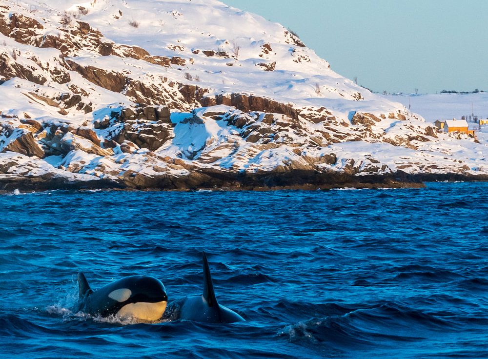 Orcas can almost always be seen with a group, a so-called "pod". They hunt together on herrings that hide in the sheltered fjords of Norway during the winter period.