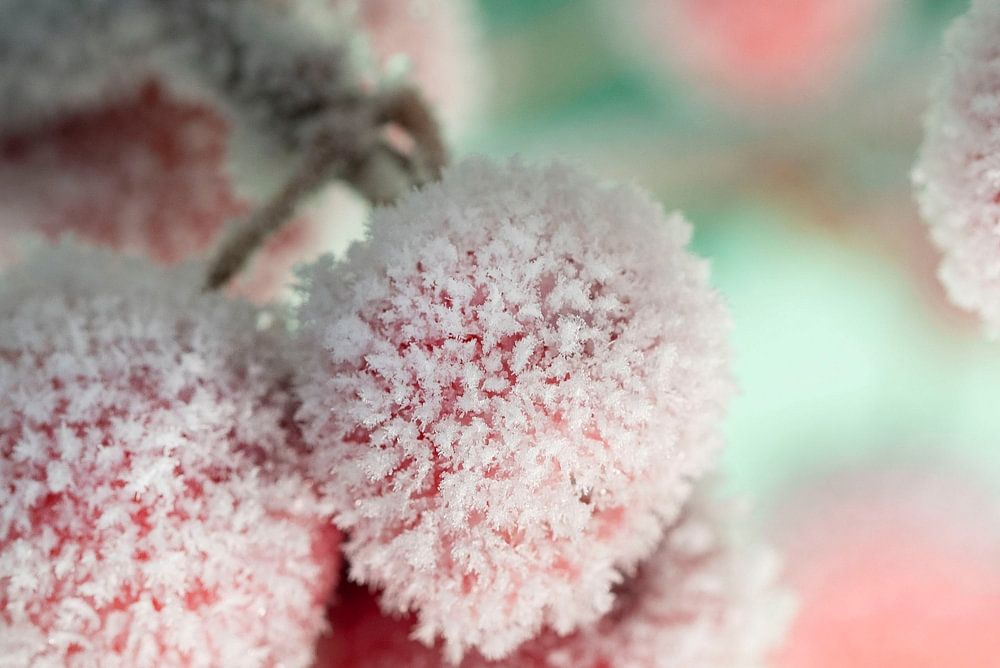 These ornamental apples are surrounded by a beautiful layer of white frost. This gives this picture a serenity that will bring tranquility to any interior.