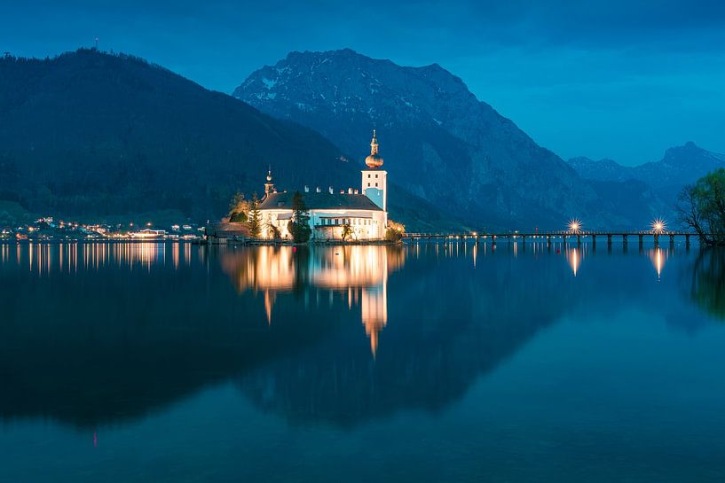 Orth Castle in Gmunden with pedestrian bridge over the Traunsee and Traunstein at dusk.