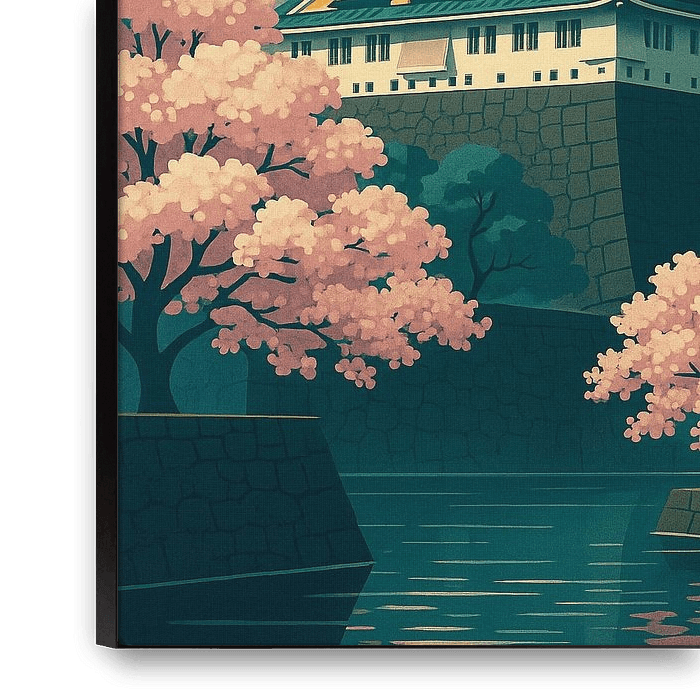 Buy this landscape artwork Osaka Castle Elegance – Art Deco Japanese Poster by Travel Shop on canvas, ArtFrame, poster and wallpaper, printed on demand in high quality.