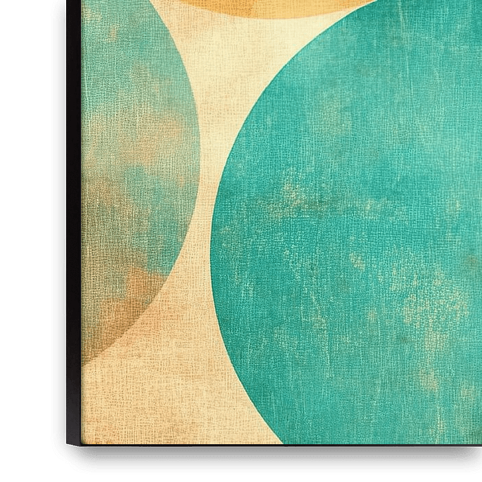 Overlapping Circles Abstract - This abstract painting features a pattern of overlapping circles in turquoise and orange tones on a textured background.