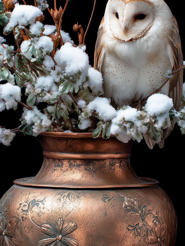 A barn owl sits gracefully in a bronze vase filled with snow-covered branches - a silent winter stillness captured in one image.