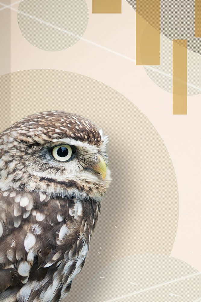 Owl in a modern setting with vignette and various elements, beige background as base with gold and green tones.