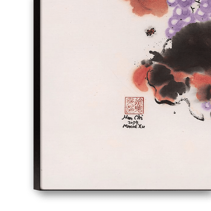 In Prosperities, the artist captures the elegance of clustered grapes hanging from their vines, rendered with a delicate interplay of impressionism and realism. The fluid brushwork conveys the natural vitality of the fruit, while subtle detailing evokes texture and form. Using a harmonious blend of traditional Chinese pigments interwoven with modern acrylics on rice paper, the piece bridges cultural heritage with contemporary expression.