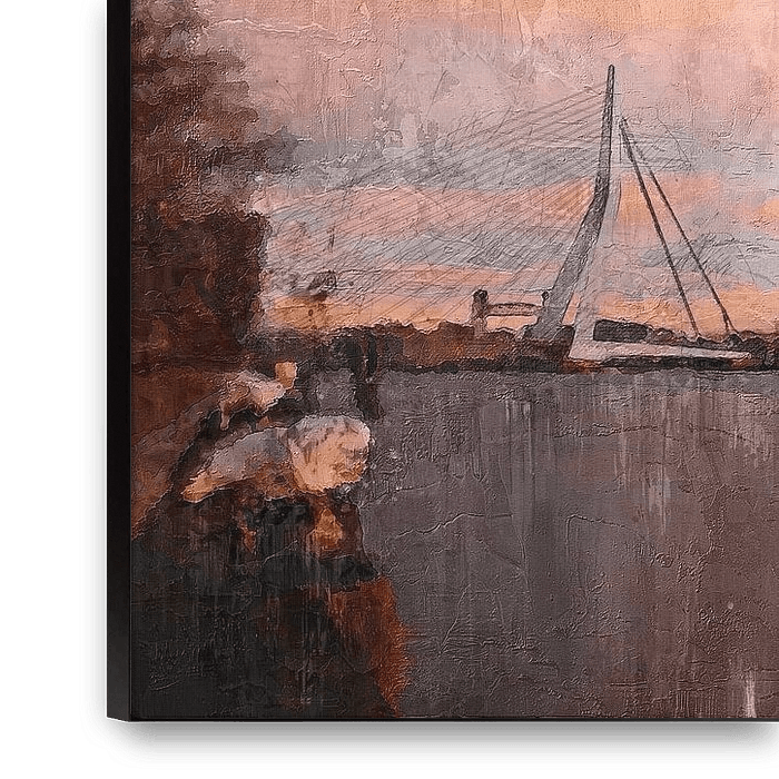 A painted view over the Nieuwe Maas towards the Kop Van Zuid in Rotterdam. Visible are the Erasmus Bridge, De Rotterdam, Hotel New York, Montevideo, etc.A lot of details and a high resolution which makes this work very well suited for a large format print.