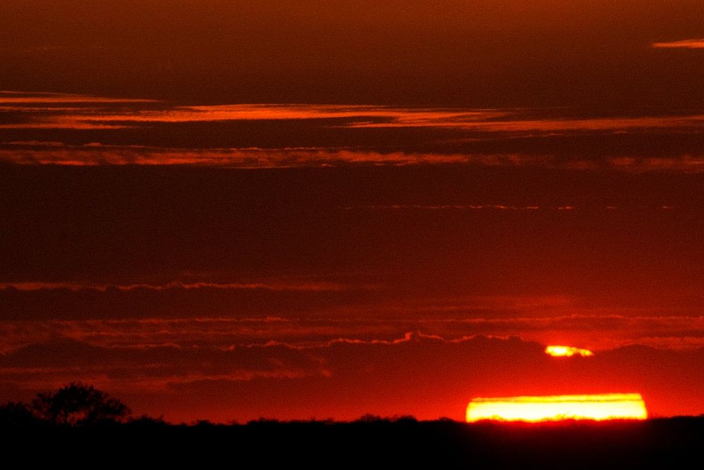 It’s a spectacular sunset, with a dramatic red sky and a fiery sun dissolving behind the clouds of the savannah, hidden, but not yet gone.