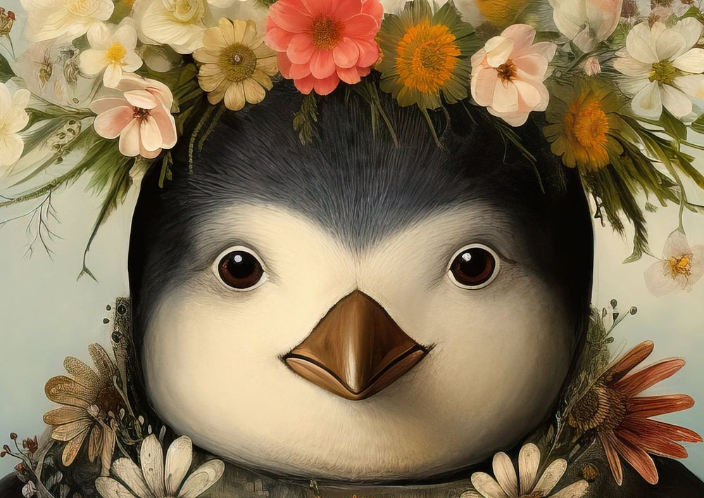 Details: penguin, flowers, crown, nature, art, painting, animal, fauna, flora, portrait