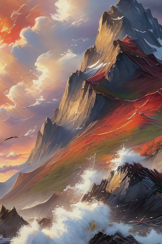 Painting A vast seascape stretches out before us, surging waves caressing the shore under a fiery sunset sky. with one majestic mountain rising in the distance, its craggy peak kissed by the golden light of the day's final breath. The calm surface of the water reflects the bright colors of the horizon, as seagulls ride on the breeze.