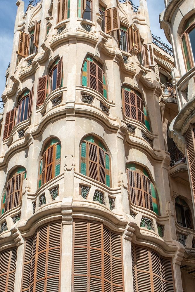 The beautiful buildings shown here are located in the Plaça del Mercat. The Plaza del Mercat is a small paved square on Calle Unió in the center of Palma. In its center is a sculpture of Antonio Maura, Spain's five-time prime minister between 1904 and 1921, and a century-old ficus tree. The handsome 18th-century bell tower of the Church of San Nicolás completes the picturesque setting.