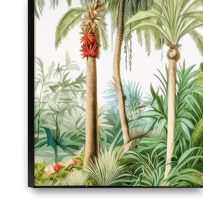 Palm trees in a tropical setting, an exotic backdrop under the radiant sun. A variety of flora and fauna thriving in its shade. A peaceful and magical atmosphere amidst the tropical splendour.