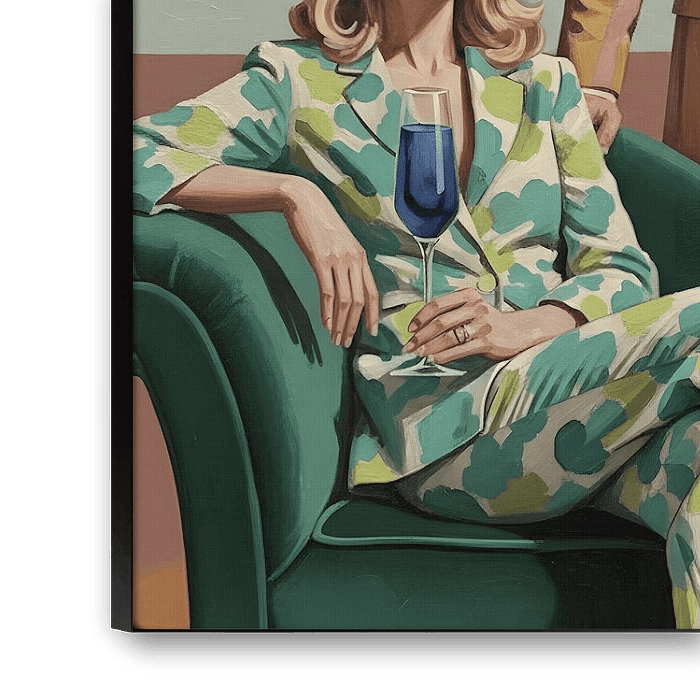This composition sets a relaxed yet stylish mood in which two people attract attention with their striking clothes and confident posture. The woman sits back elegantly on a green chaise longue. Her mint-green suit with large floral patterns blends fresh colours with a playful design, making her appearance instantly striking. Her white cat-eye sunglasses and the blue drink in her hand convey a sense of luxury and carefree elegance. The way she crosses her legs and rests her arm on the banister suggests absolute control and sophistication, as if she is completely at home in this colourful environment.