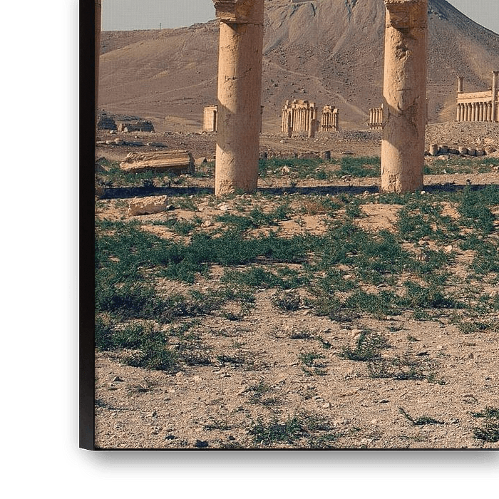 Syria - This picture shows a scene that looks as if time has stood still. In the middle of the vast desert landscape of Syria, the stone columns of Palmyra stretch upwards into the blue sky - upright, dignified, as if they still want to bear witness to the former greatness of this city. In the background, watchtowers and the remains of other buildings can be seen, embedded in a landscape that seems almost otherworldly, and the harmony between nature and architecture is particularly noticeable here. The rolling hills, the even light, the shadows of the capitals - everything tells of a place that has seen a lot and survived even more. Palmyra was not only a trading centre, but also a cultural beacon. Those who stayed here experienced a melting pot of civilisations, and today this place is a silent witness to past greatness - and this picture is a window into a world that is otherwise only known from history books. For lovers of ancient aesthetics, desert landscapes and monumental silence. A work of art that builds a bridge between past and present in any room