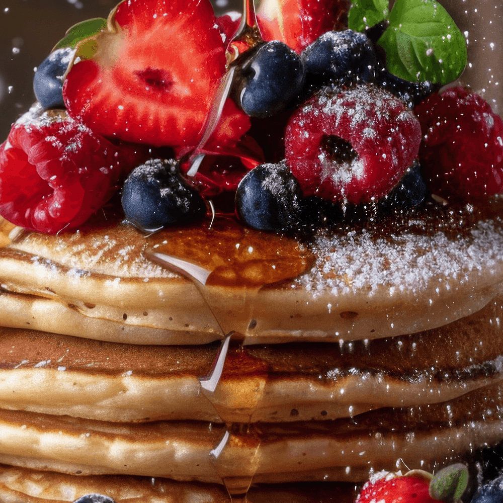 Enjoy the sight of juicy pancakes topped with fresh berries and a sprinkling of icing sugar. The sweet syrup running over the fluffy pancakes brings the picture to life and makes it the perfect eye-catcher in any kitchen or dining room. Ideal for breakfast lovers and fans of culinary art who want to create a warm and inviting atmosphere.
