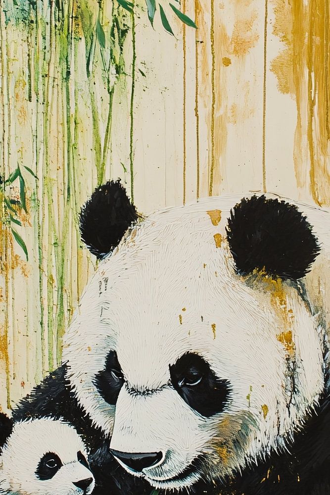 A beautiful painting of a loving panda and her cub surrounded by an atmospheric bamboo forest. The design combines an artistic expressive style with warm tones, perfect for creating a unique atmosphere in your interior. Ideal for nature lovers or as a calming focal point in any room.
